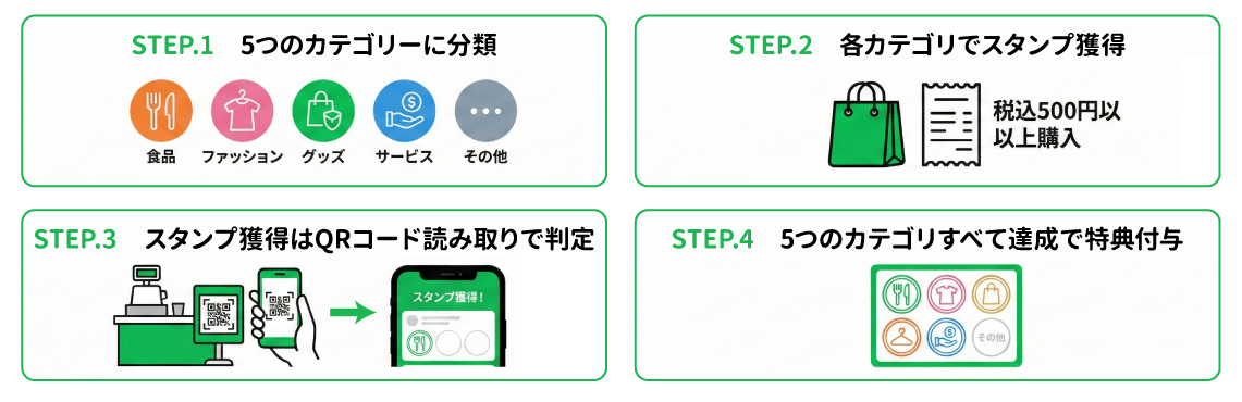 - STEP.2:各カテゴリで「税込500円以上購入」でスタンプ獲得