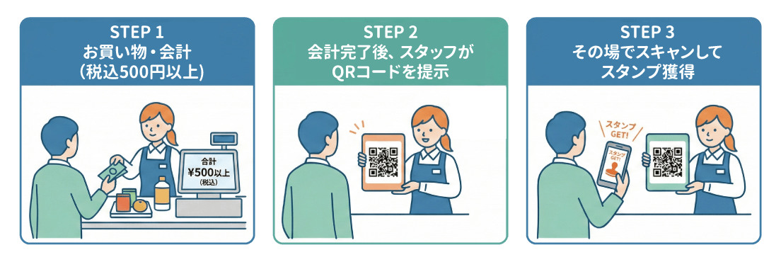スタンプの付与は、税込500円以上の会計完了後に、レジでスタッフがQRコードを提示する方式とします。