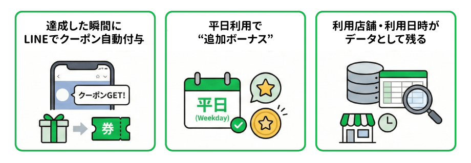 - 参加者・達成者・利用店舗などが自動でデータ化される