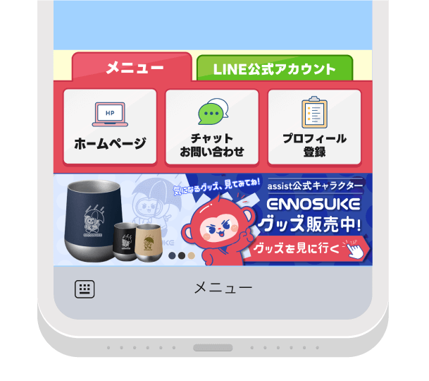 タブで切り替えられる「LINE公式アカウント」メニューでは、assistが提供する各コンテンツへ遷移できる総合メニューが表示されます。