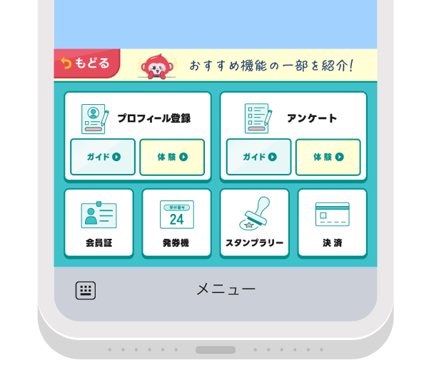 プロフィール登録、スタンプラリー、会員証、発券機、決済機能、メッセージ配信…。
