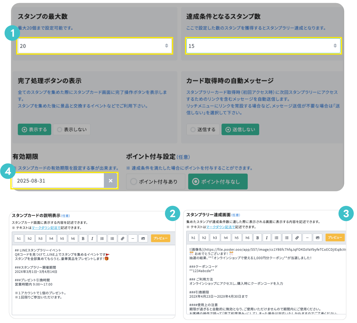 配信設定(上限) メッセージを適切なタイミングで届けるための設定作業です。主な設定には、リッチメッセージ・リッチメニュー・クーポン・ショップカードの設定があります。 | - | - | - |